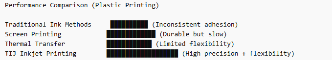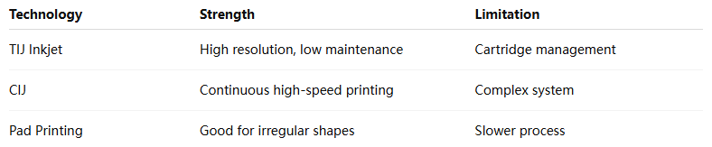 Modern TIJ (Thermal Inkjet) systems are increasingly used for plastic printing due to their high resolution, low maintenance, and fast drying inks.